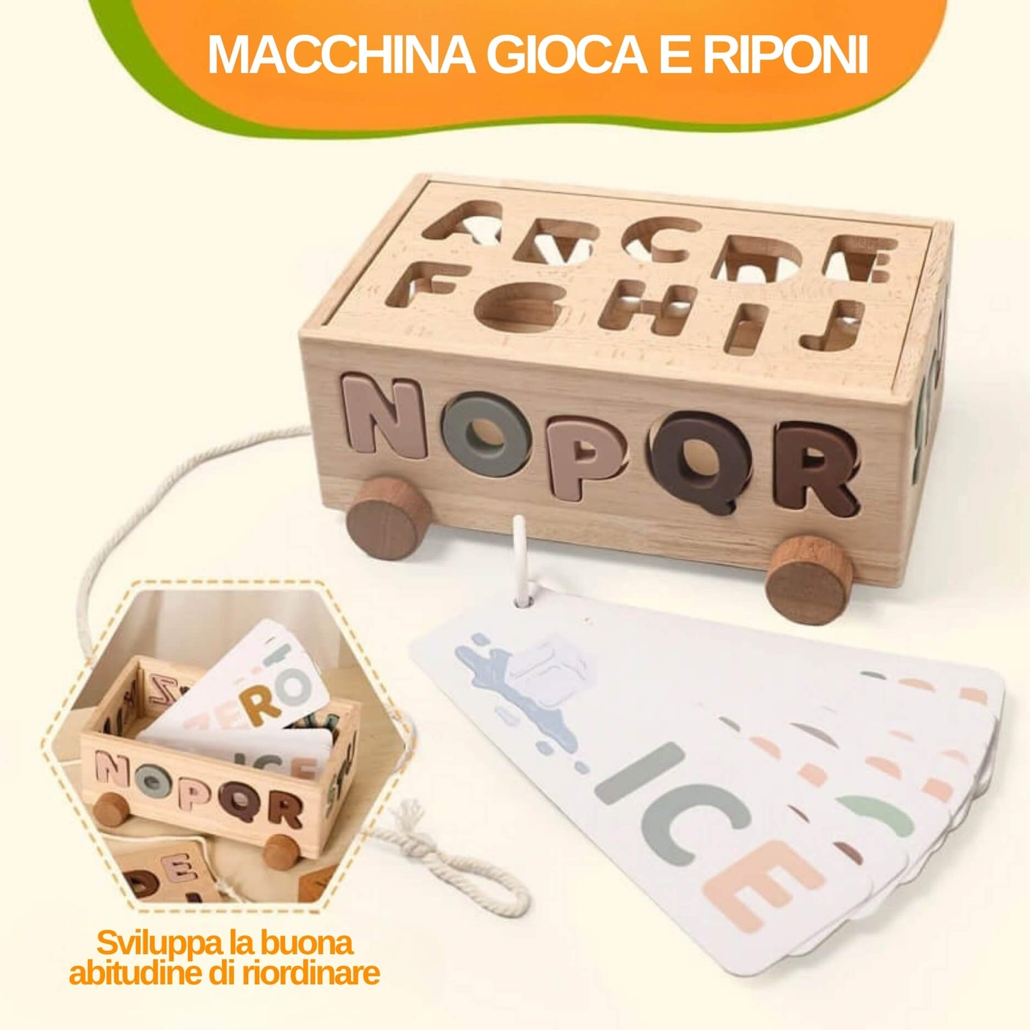 Macchina in Legno con Lettere dell’Alfabeto è un giocattolo in legno studiato per avvicinare i bambini dai 3 anni alle prime competenze linguistiche in modo naturale e giocoso. Le lettere rimovibili si abbinano alle carte illustrate: il bambino sceglie una carta, trova la lettera giusta, compone la parola e “guida” la macchinina alla scoperta di nuovi suoni.