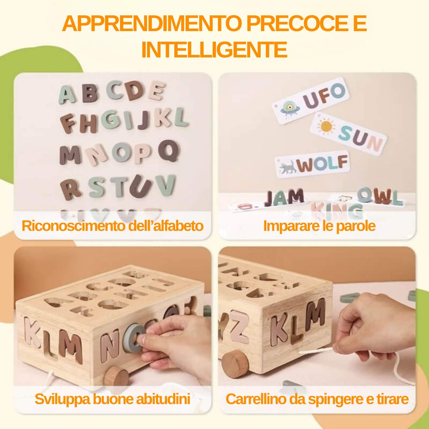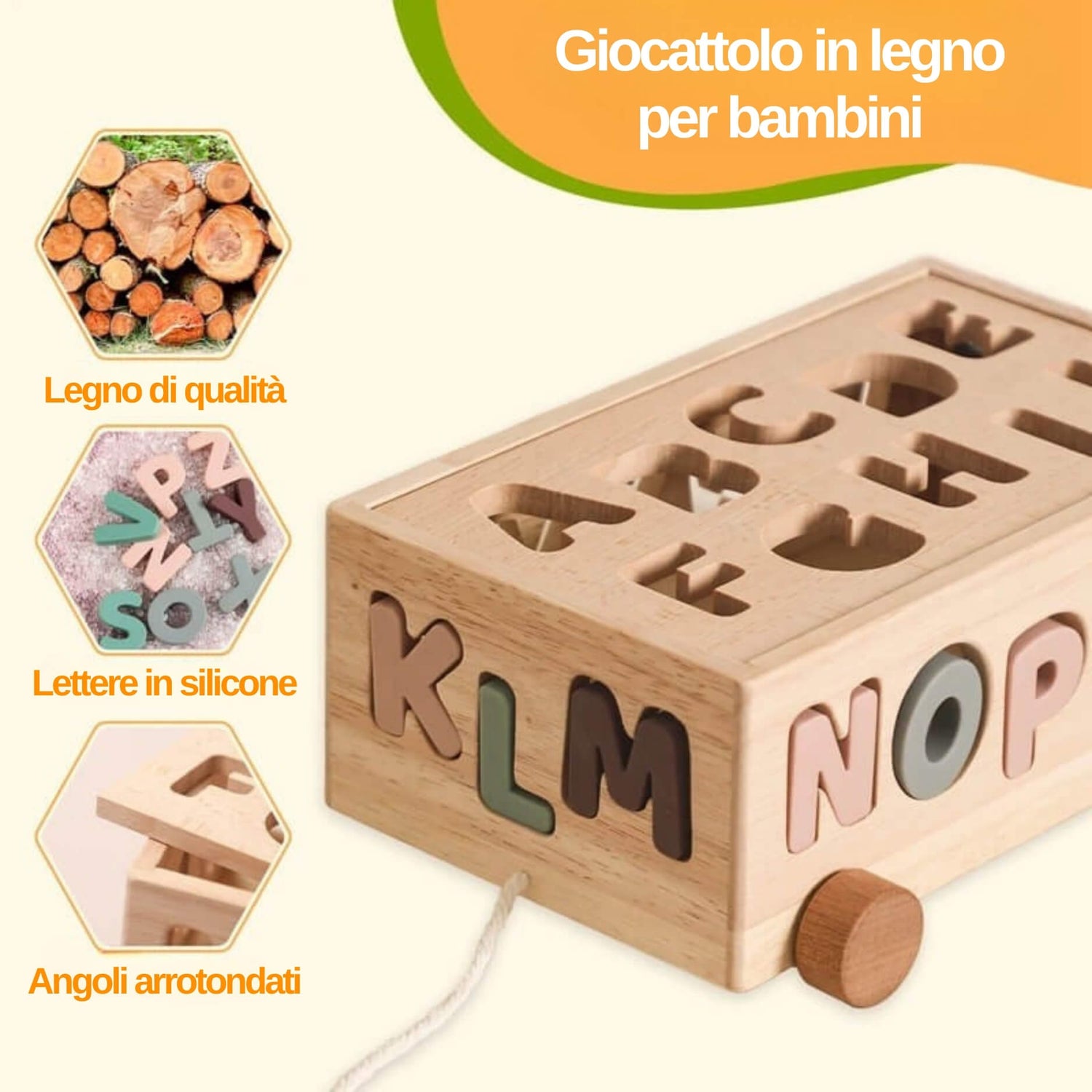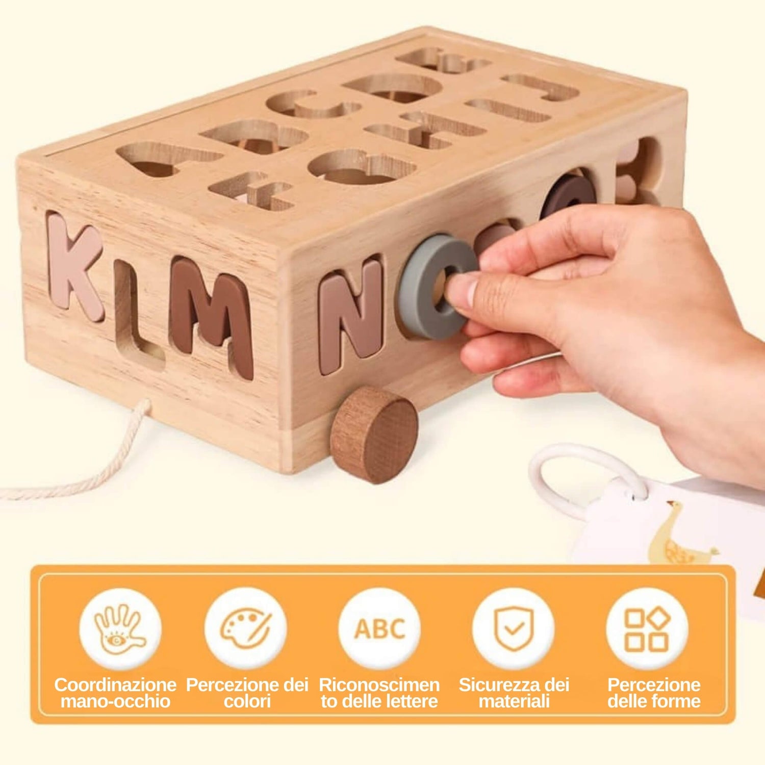 La Macchina in Legno con Lettere accompagna i bambini dai 3 anni nella scoperta dell’alfabeto, con lettere da inserire e carte da abbinare. Un gioco coinvolgente che stimola linguaggio, autonomia e concentrazione, perfetto per le prime esplorazioni linguistiche.
