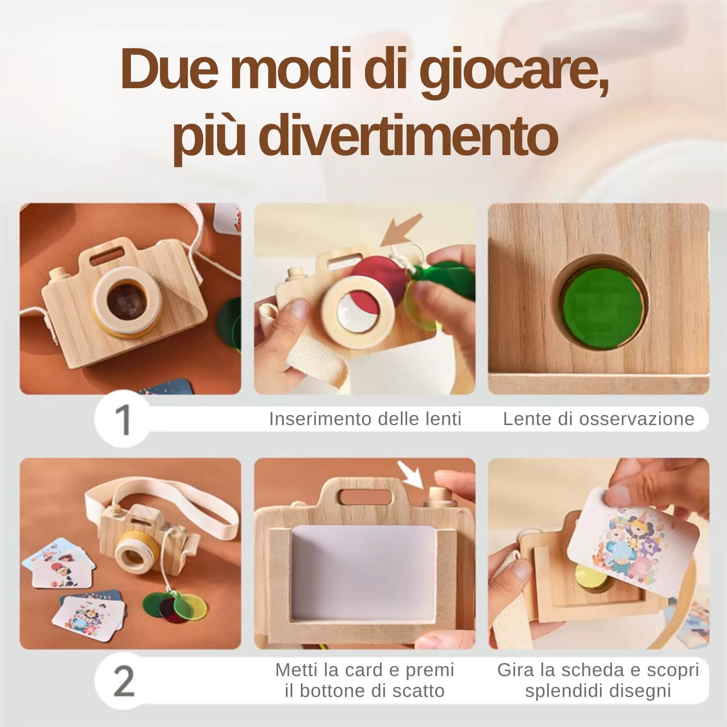 La macchina fotografica in legno offre due modalità di gioco: inserisci i filtri colorati per osservare il mondo con nuove tinte, oppure inserisci le card illustrate e premi il pulsante come un vero otturatore. Un gioco educativo in legno ispirato al metodo Montessori che allena osservazione, logica e gioco simbolico dai 18 mesi