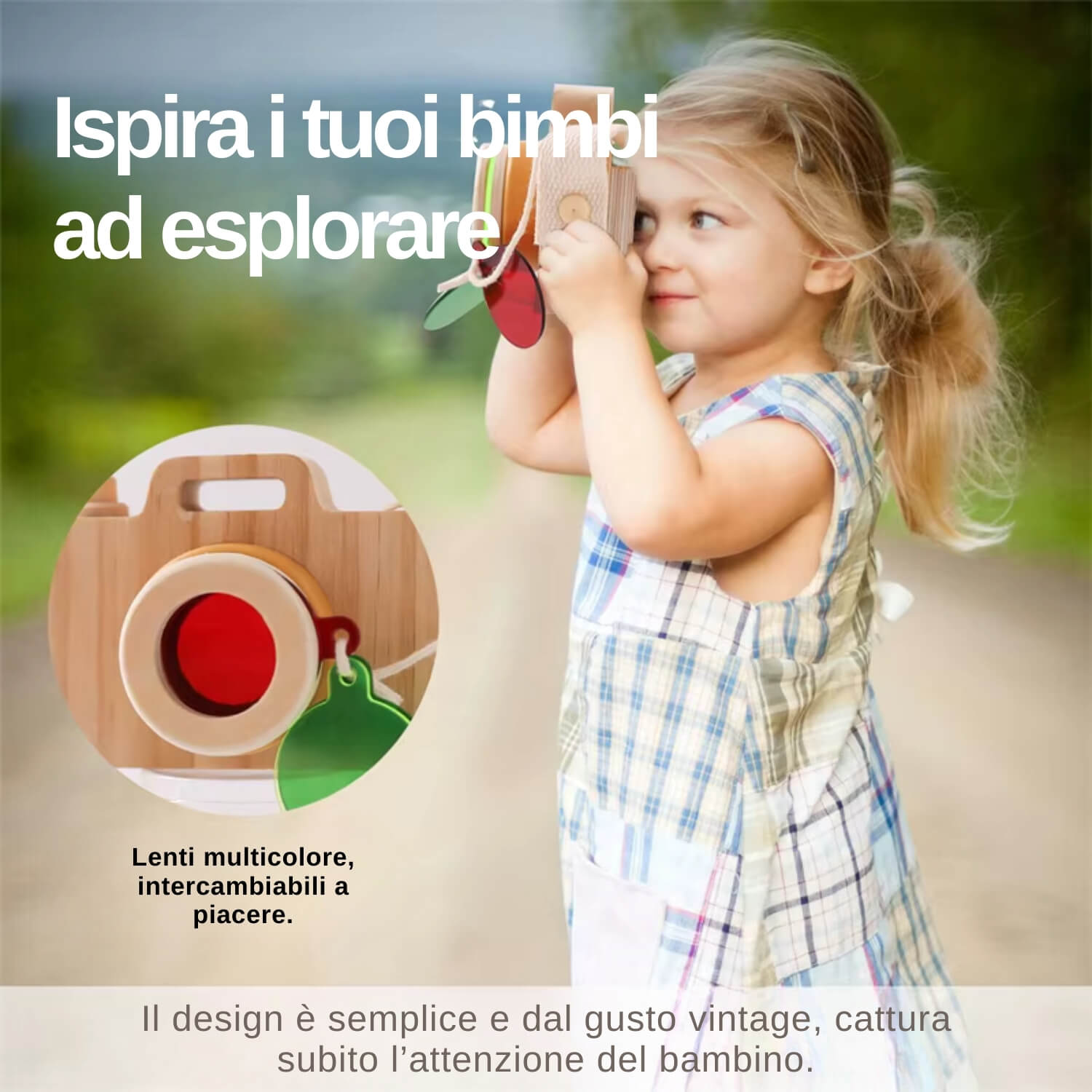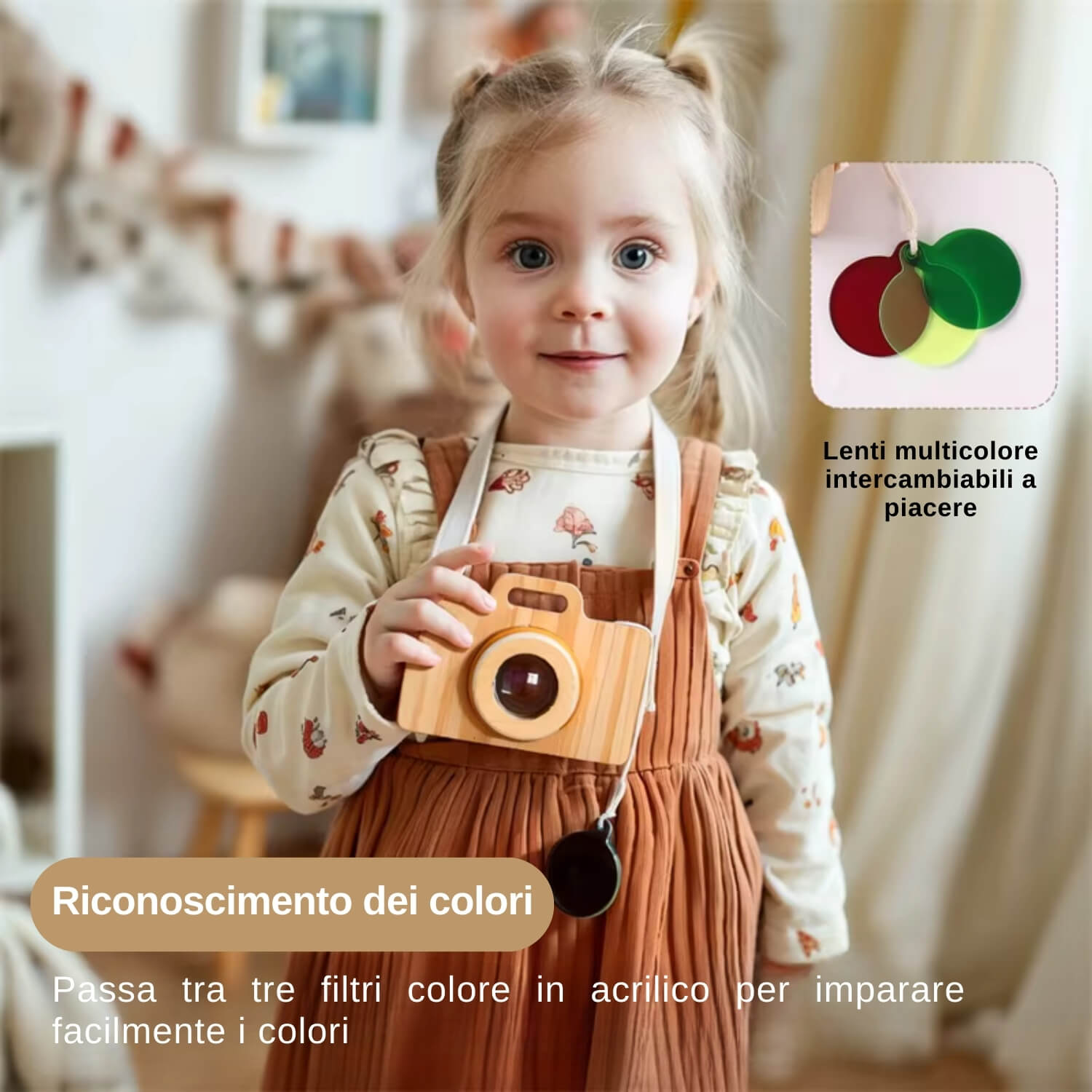 Nella confezione trovi la macchina fotografica in legno, 3 filtri colorati intercambiabili e card illustrate da osservare. Tutto l’occorrente per iniziare subito a giocare in modo educativo e naturale.