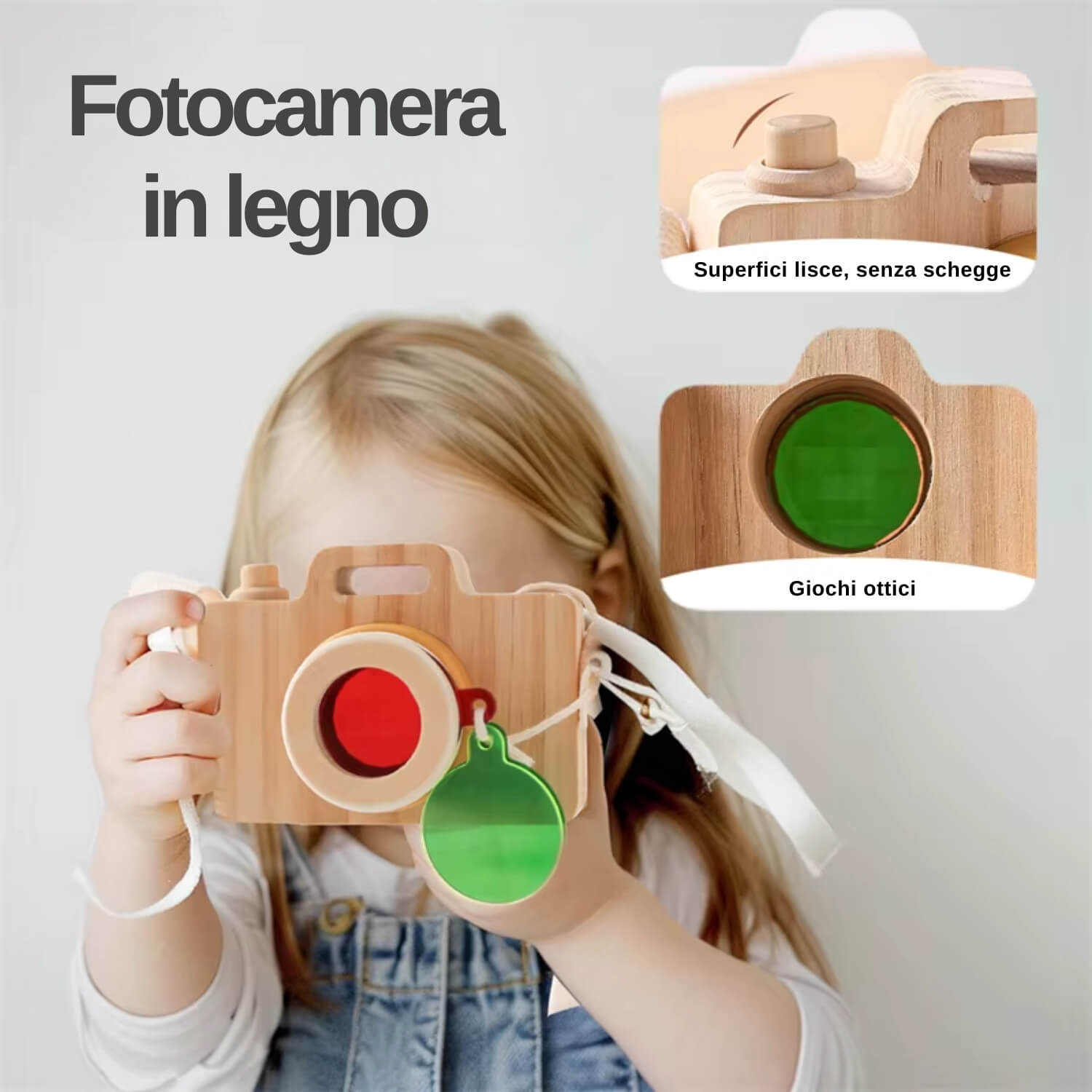 Macchina Fotografica in Legno per Bambini è un giocattolo in legno dedicato ai piccoli dai 18 mesi. Compatta, leggera e piacevole da impugnare, è realizzata in legno naturale con finitura liscia e colori atossici: sicura, resistente e adatta alle mani più piccole.